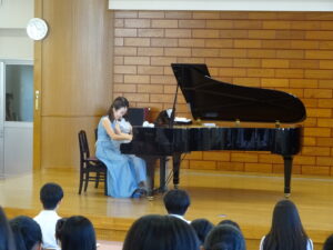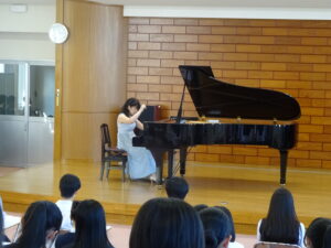 内容は、36期生・堀桃果さんの伴奏で、同期の角木タミエさんによるソプラノ独唱、18期生・戸島園恵さんの伴奏で、33期生・森みくさんによるクラリネット独奏、本校講師で5期・高森静香先生によるピアノ独奏、戸島園恵さん、高森静香さんによるピアノ連弾でした。プログラムの最後に、恒例の「呉羽高校校歌」を演奏者と鑑賞した在校生で合唱し、演奏会を締めくくりました。