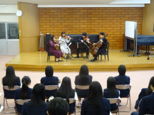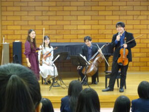 令和7年10月31日(金)14時20分より本校多目的ホールにおいて、弦楽四重奏団<カルテット・ルーチェ>によるアウトリーチコンサートが開催され、本校音楽コース生が鑑賞しました。