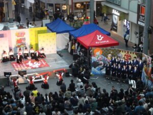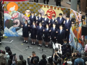 令和7年11月1日(土)に、富山まちなか賑わい広場『グランドプラザ』で「開局35周年記念 チューリップテレビ感謝祭 つくる あしたを」が行われ、本校音楽部と書道部がステージイベントに出演しました。