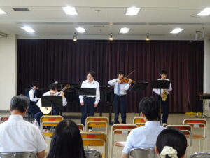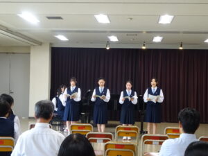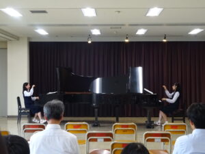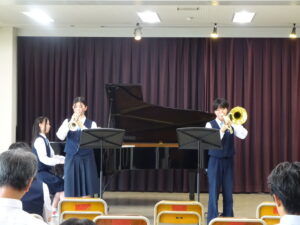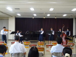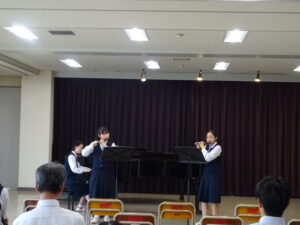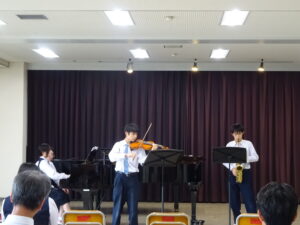 10月3日(金)13時20分より本校コモンホールにおいて、「令和7年度 総合探究発表会<感情>」が行われ、本校音楽コース3年生が演奏しました。探究活動の一環として、練習はもちろん、演奏会の開催にあたって必要な準備をすべて生徒たちで行いました。本番では、自分たちで考えた編成で重奏作品を演奏し、ご来場いただいた方々にお楽しみ頂きました。